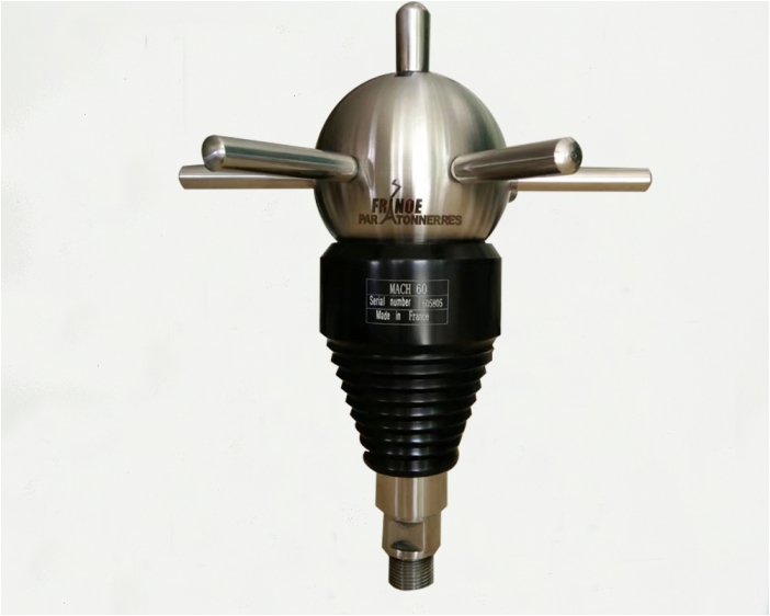 在分析雷電放電機理時,France Paratonnerres的技術團隊注意到,在對地放電的瞬間,先導通道將高電勢從高空的帶電云層帶到近地面,使近地面的空間局部電場可達幾萬伏/米,足以保證IONIFLASH MACH避雷針收集足夠的能量將空氣擊穿,釋放自由離子,在先導頭部和大地之間構建起導電通道,率先完成接閃,從而保護周圍構筑物。