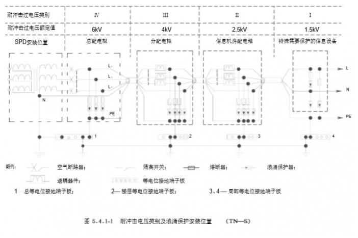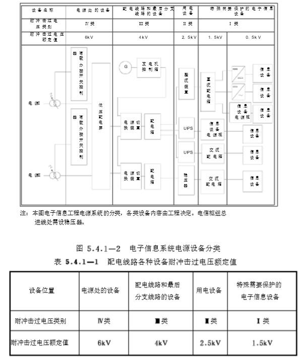 3.配電線路設(shè)備的耐沖擊過電壓額定值應(yīng)符合表 5.4.1-1規(guī)定. 電子信息系統(tǒng)設(shè)備配電線路浪涌保護(hù)器安裝位置及電子信息系統(tǒng)電源設(shè)備分類示意如圖5.4.1-1和圖5.4.1-2所示。