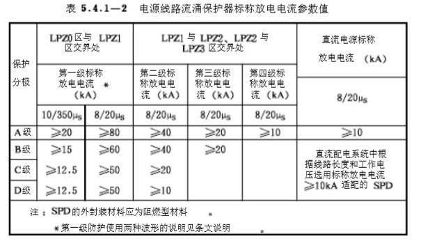7.用于電源線路的浪涌保護(hù)器標(biāo)稱放電電流參數(shù)值宜符合表5.4.1-2規(guī)定。